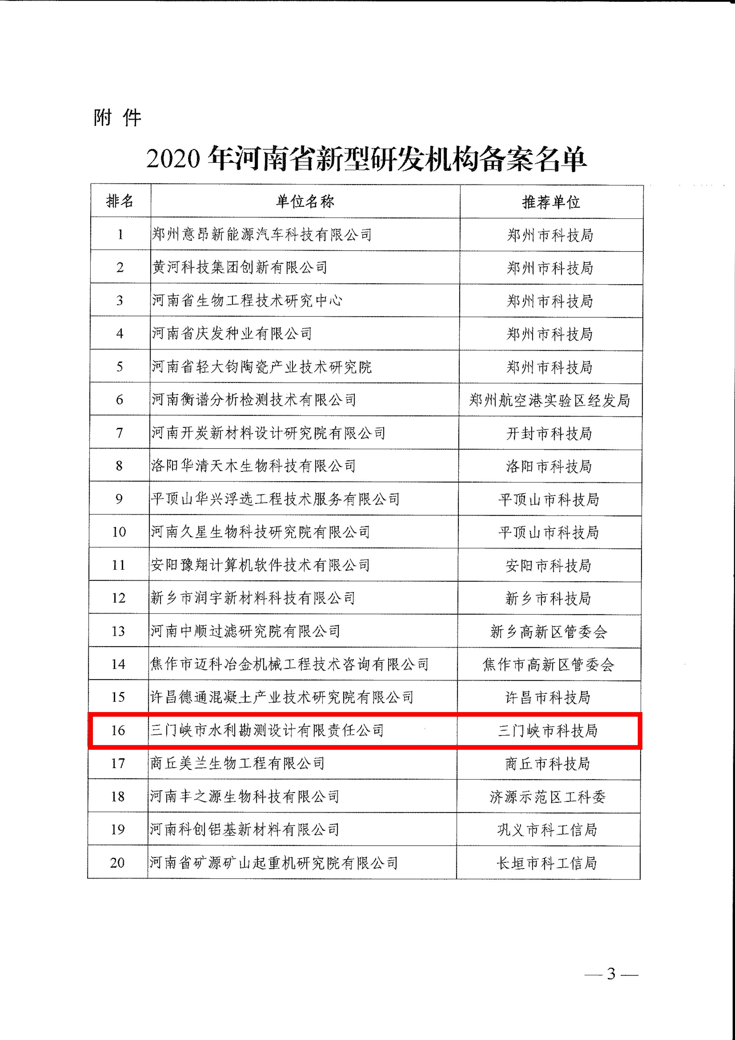根據 《關于開展2020年省新型研發機構備案登記工作的通知》(豫科成〔2020〕4號)精神。為深入實施創新驅動發展戰略,加快推進河南省創新引領型機構建設,河南省科技廳組織開展了2020年省新型研發機構備案工作。三門峽市水利勘測設計有限責任公司申報2020年河南省新型研發機構成功獲批。