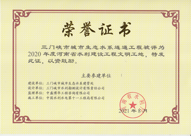 近日,我公司設計的“三門峽市城市生態水系連通工程”,建設工地被河南省水利廳評為“河南省2020年度水利建設工程文明工地”。我公司將繼續秉持嚴謹、求實的精神,細化項目中有關施工現場規范化的設計,推進施工現場規范化管理,促進地方水利工程建設管理水平再上新臺階。