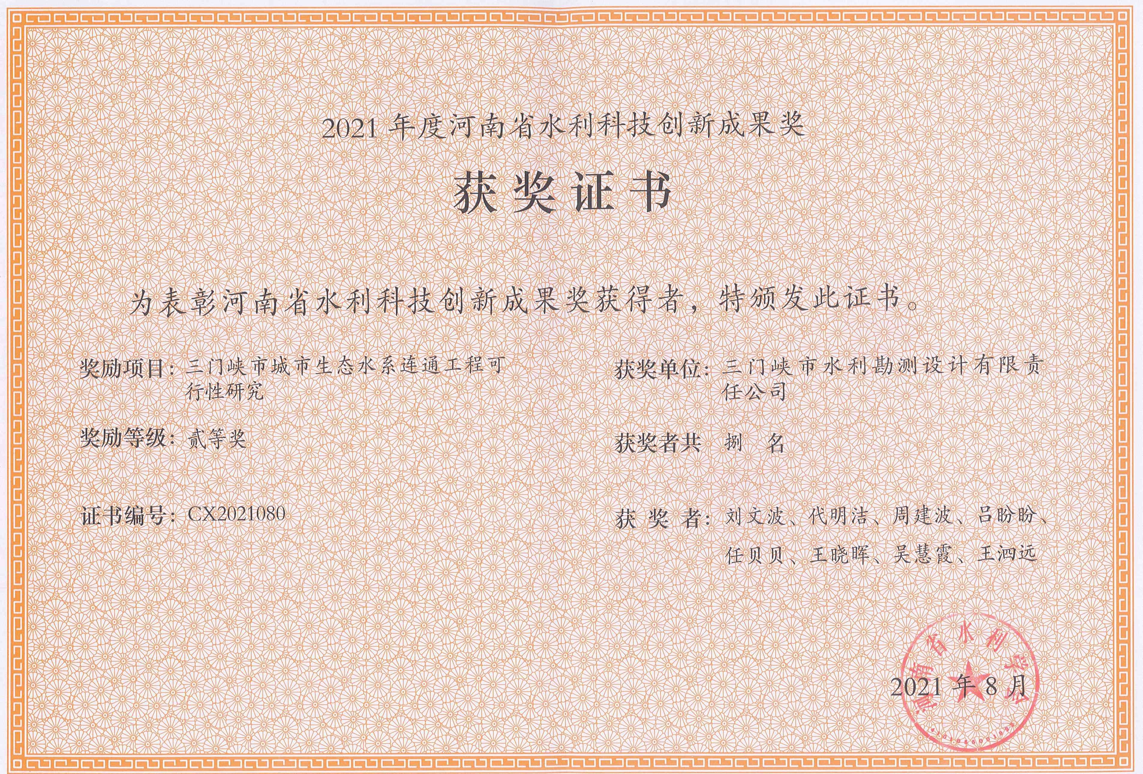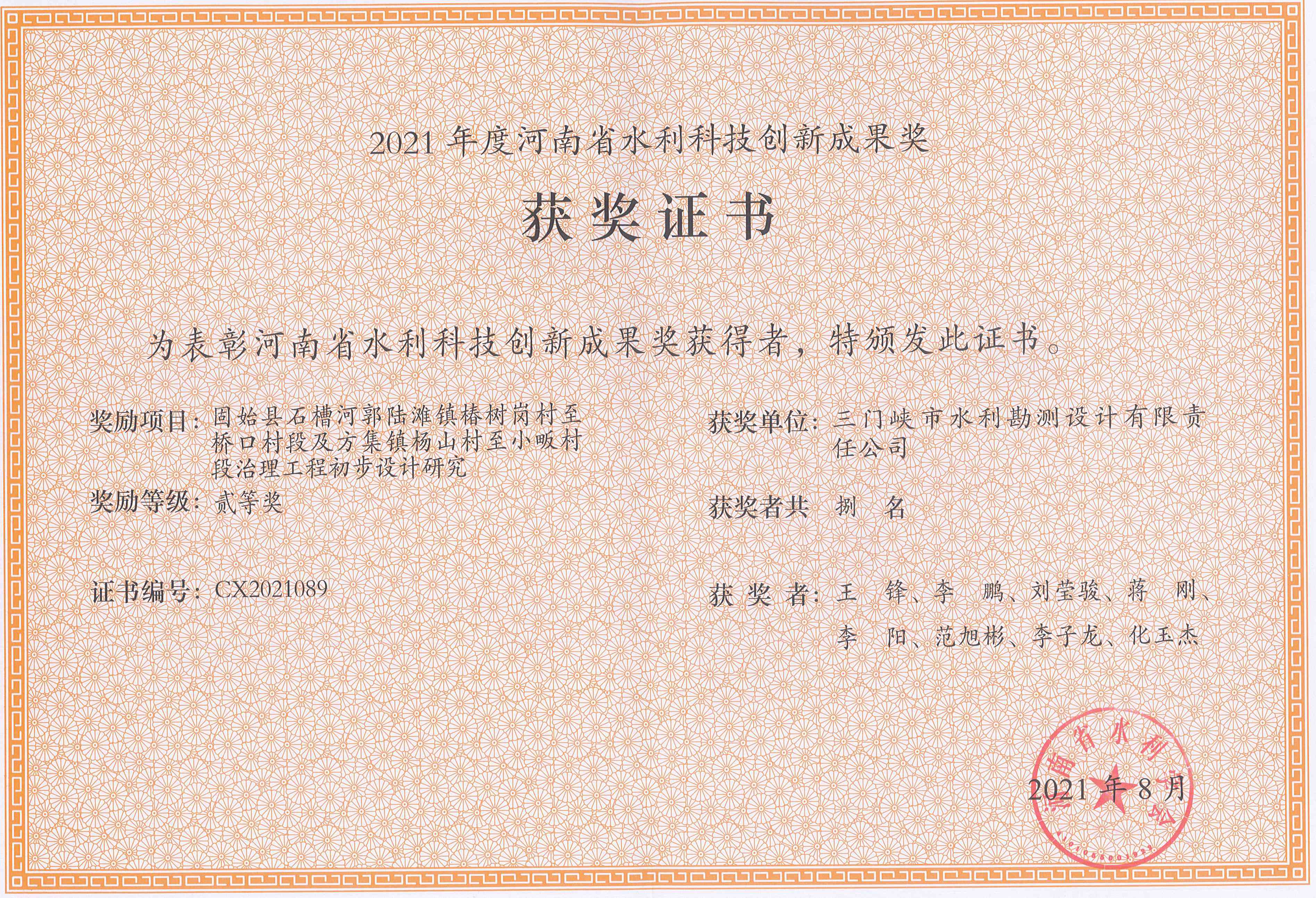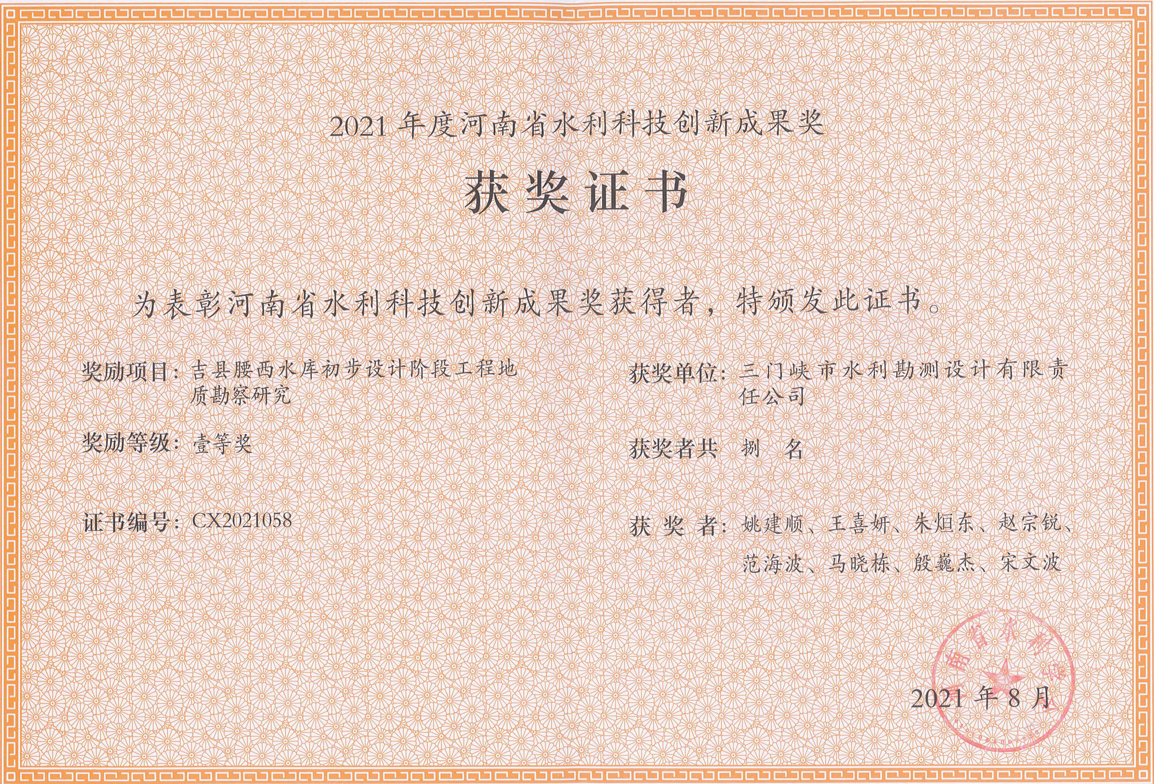 2021年8月,由我公司承擔完成的《吉縣腰西水庫初步設計階段工程地質勘察研究》、《三門峽市城市生態水系連通工程可行性研究》和《固始縣石槽河郭陸灘鎮椿樹崗村至橋口村段及方集鎮楊山村至小畈村段治理工程初步設計研究》分別獲2021年度河南省水利科技創新成果一等獎和二等獎。