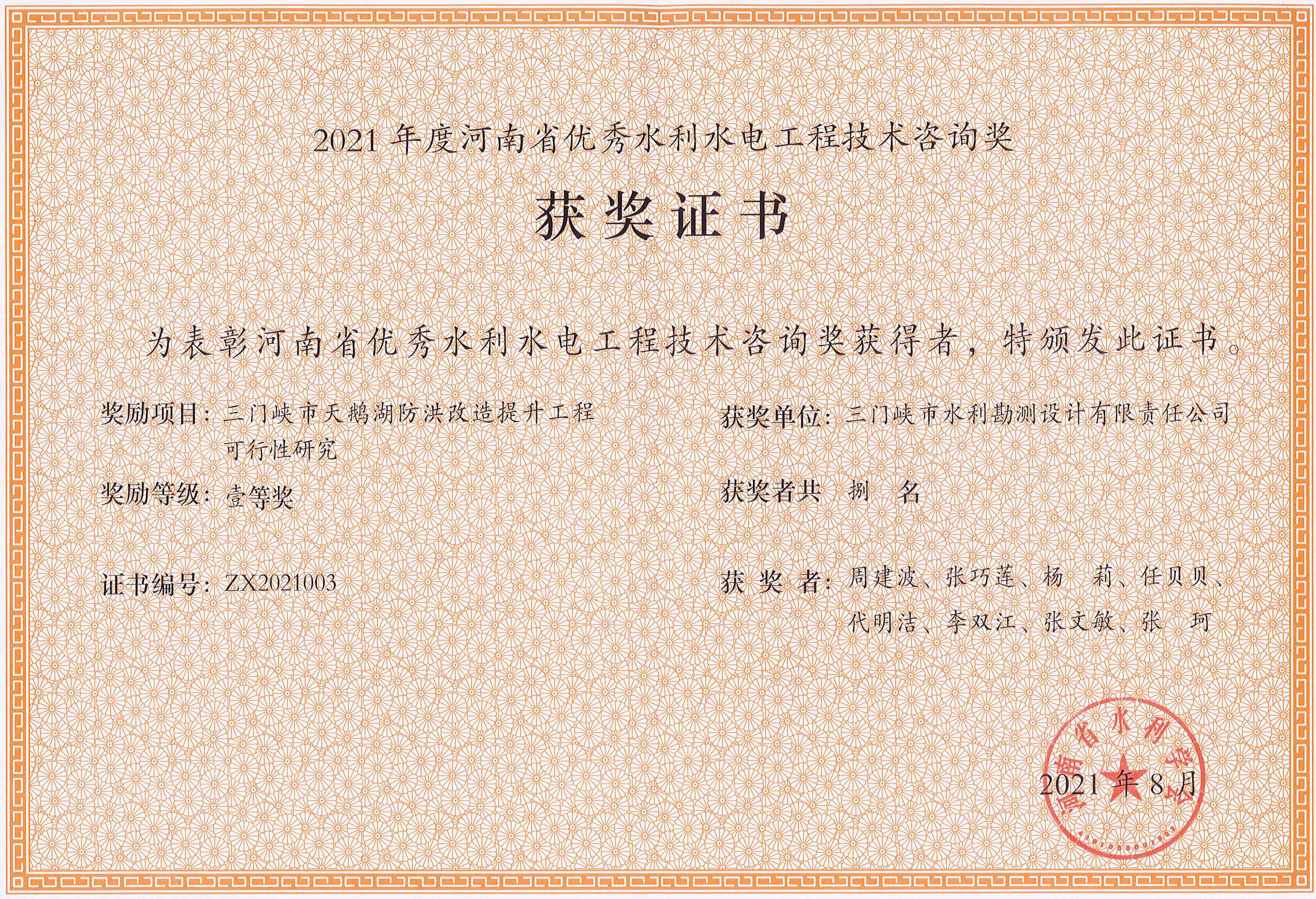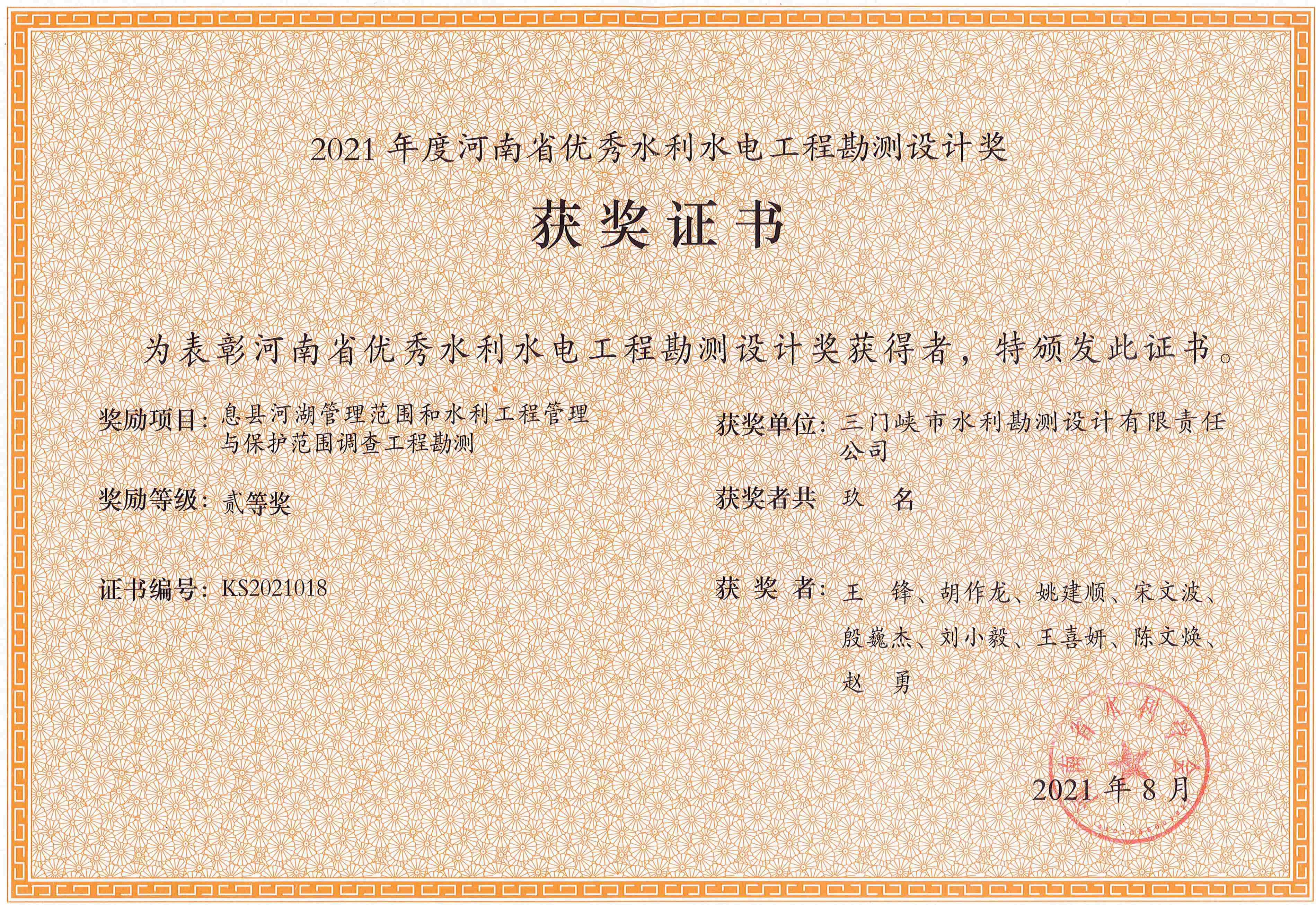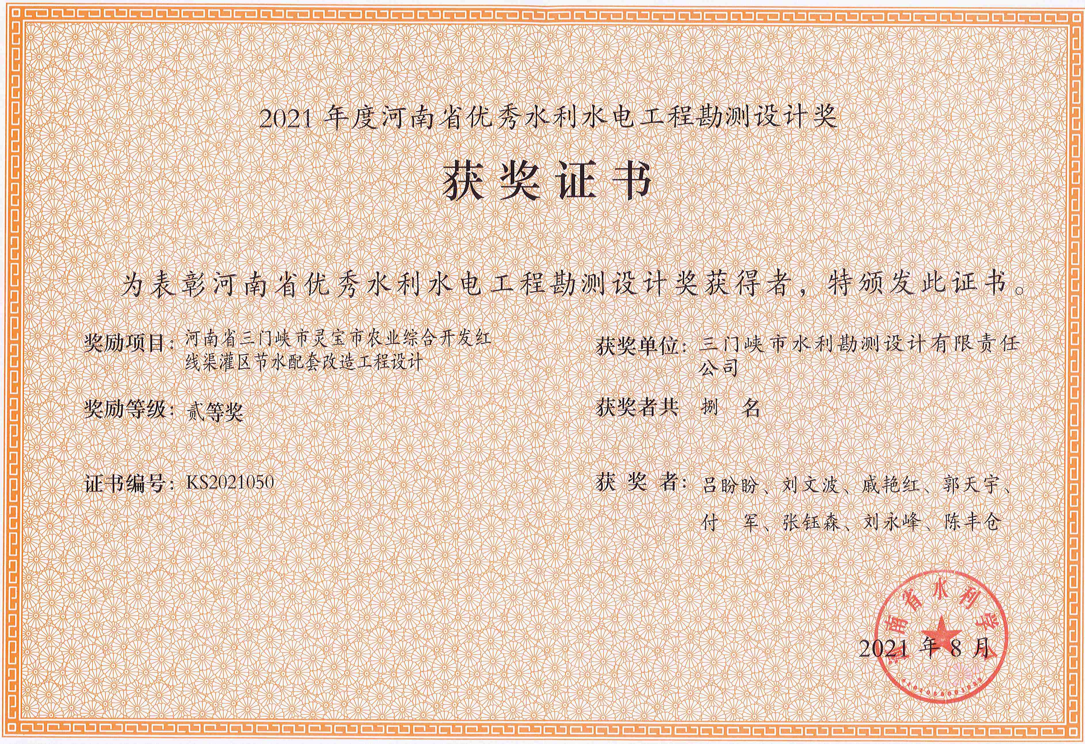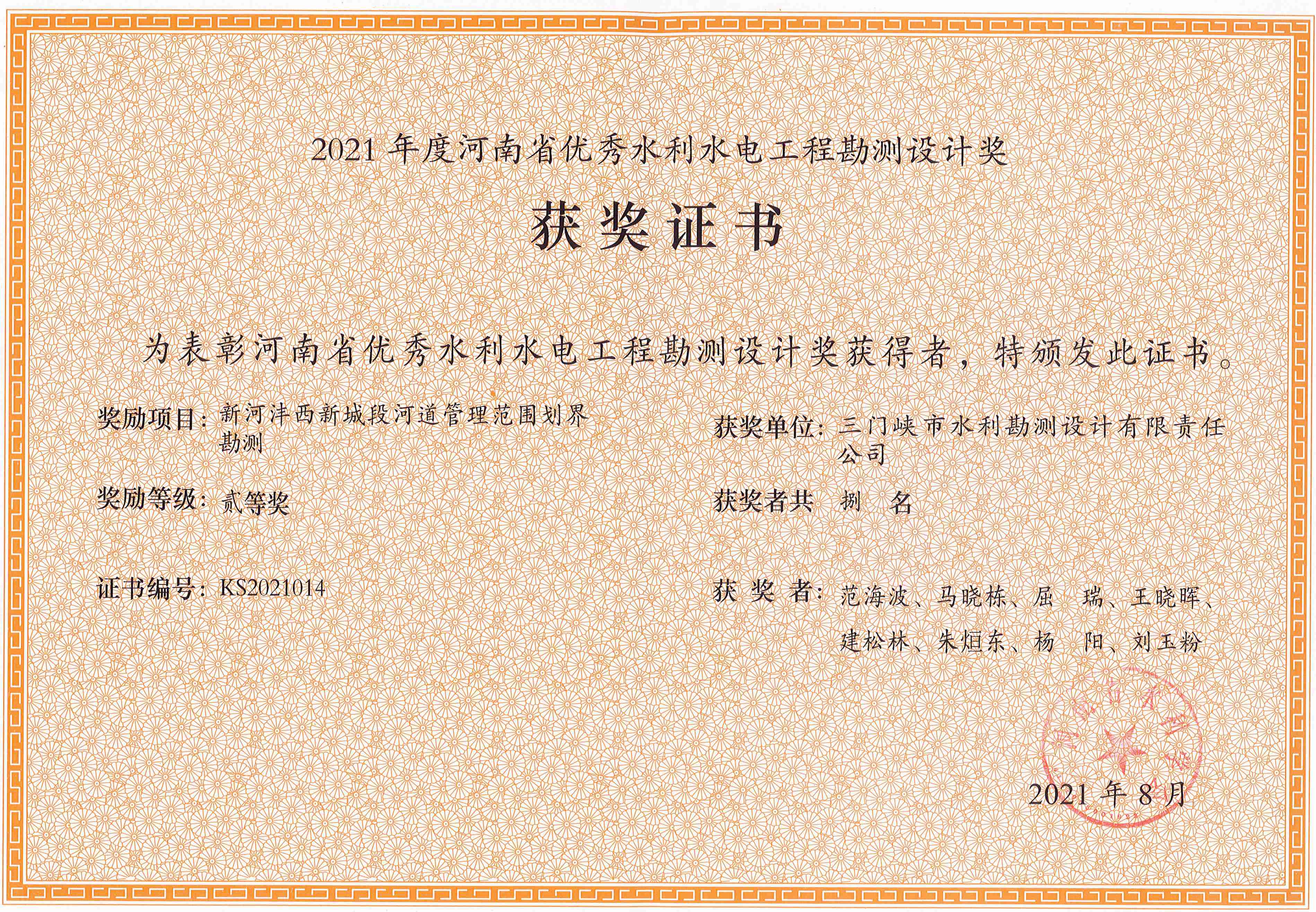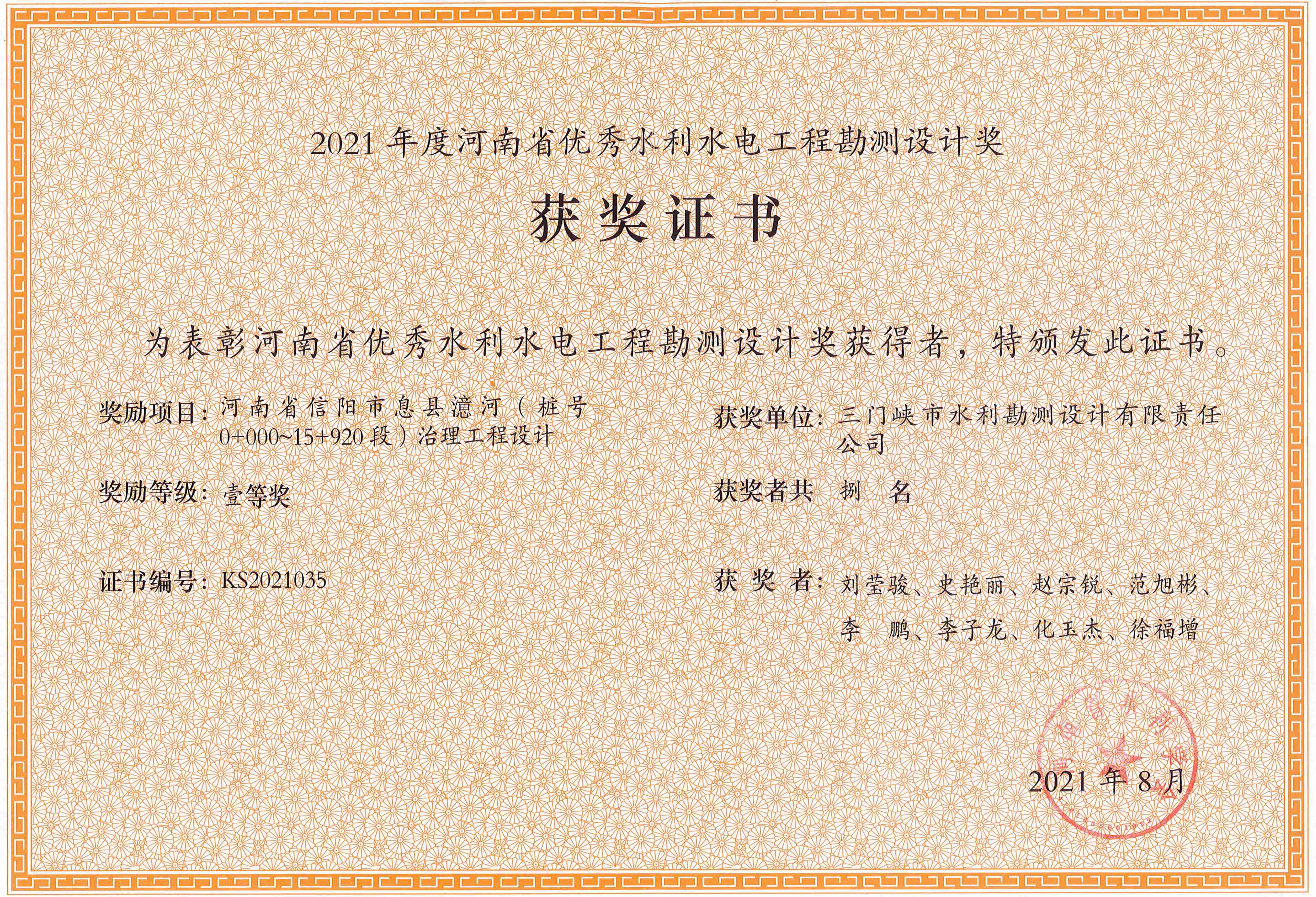 近日,由我公司承擔完成的五個項目分別獲2021年度河南省優秀水利水電工程勘測設計獎一等獎和二等獎。其中,獲一等獎的項目有《三門峽市天鵝湖防洪改造提升工程可行性研究》、《河南省信陽市息縣澺河(樁號0+00-15+920段)治理工程設計)》;二等獎的項目有《河南省三門峽市靈寶市農業綜合開發紅線渠灌區節水配套改造工程設計》、《息縣河湖管理范圍和水利工程管理與保護范圍調查工程勘測》和《新河灃西新城段河道管理范圍劃界勘測》。
