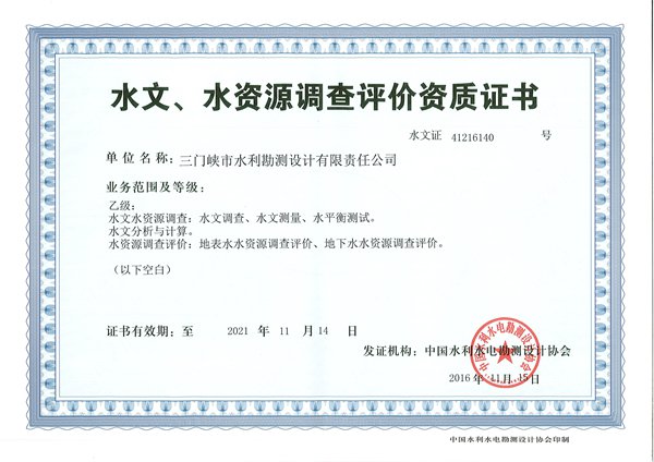 正近日,報水利部批準,我公司獲得水文水資源調查評價乙級資質。該資質是開展相關業務的基本資格,可以在全國范圍內承擔資質證書核準業務范圍的各等級水文水資源調查評價工作,主要范圍包括:水文水資源調查、水文分析與計算、水資源調查評價。