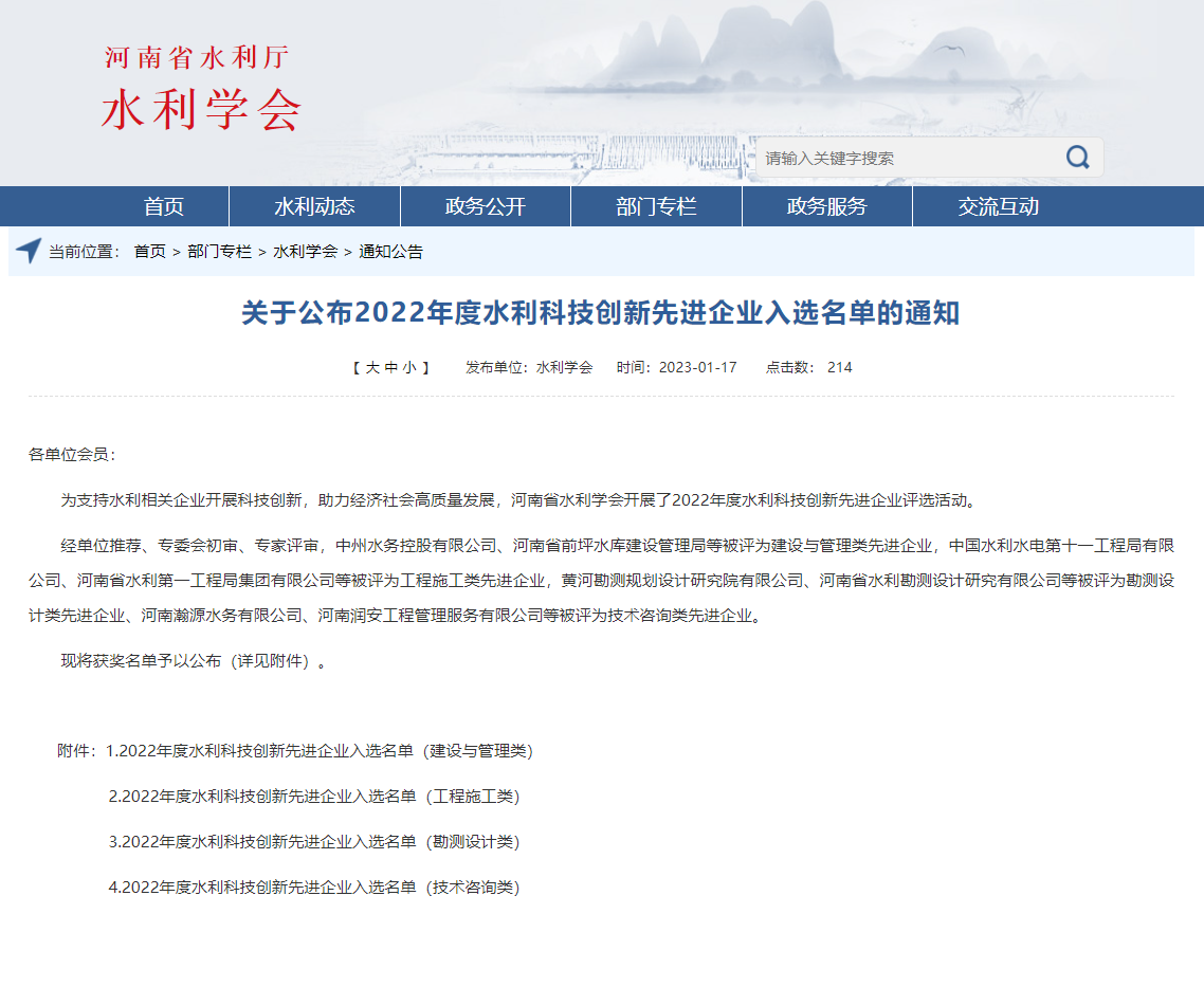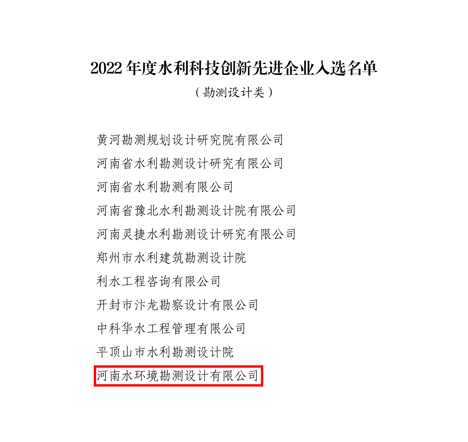 河南省水利學會組織開展了2022年度水利科技創新先進企業評選活動,經單位推薦、專委會初審、專家評審,我公司被評為勘測設計類先進企業。