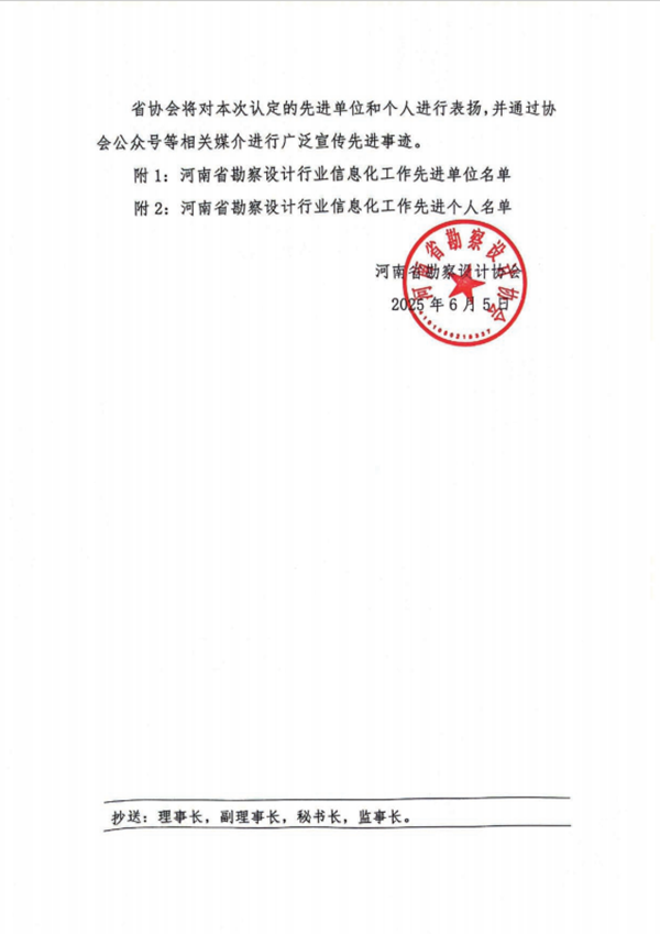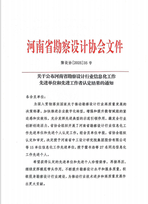 2025年6月13日,我公司憑借在水利信息化建設中的突出貢獻,被河南省勘察設計協會授予信息化工作"先進單位"榮譽稱號,公司董事長張文敏等兩人被評為“先進工作者”。該獎項充分肯定了公司在智慧水務創新應用示范基地建設、智慧水務平臺研發、大數據應用及防汛抗旱數字化服務等方面的創新研發和應用成果。近年來,公司累計為全國100余個水利項目提供數字化設計方案和軟件產品。未來,公司將深化"科技+水利"融合,堅持科技賦能,以數字化為引領,聚焦中小型涉水項目建設全生命周期服務。